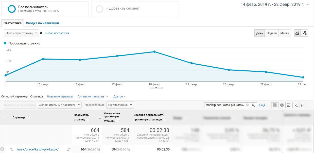 Активность во время закрепления анонса на главной. 584 уникальных пользователей открыли полную информацию о вас на сайте. Примерно 2 минуты 30 секунд посетители сайта находились на странице.