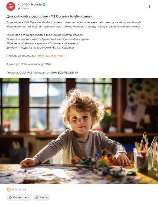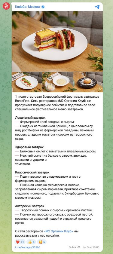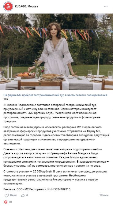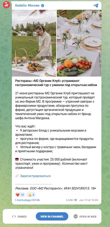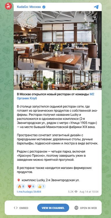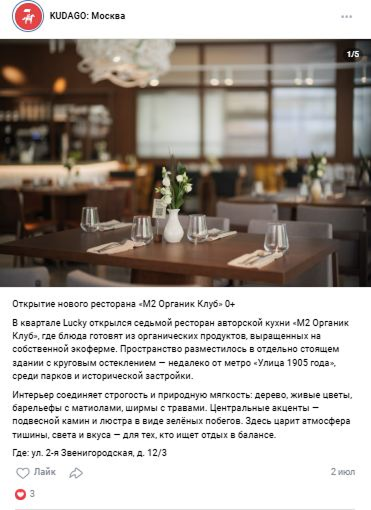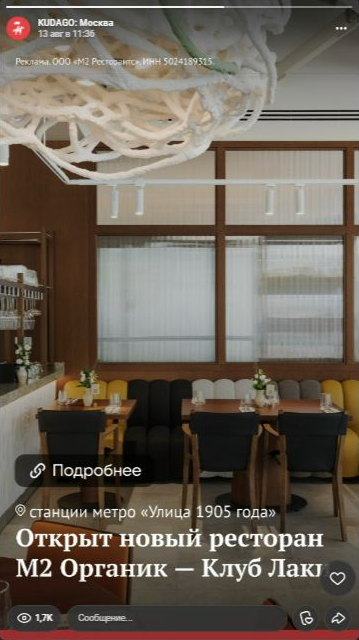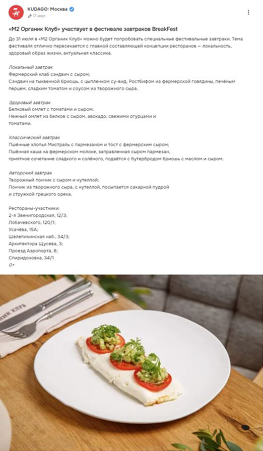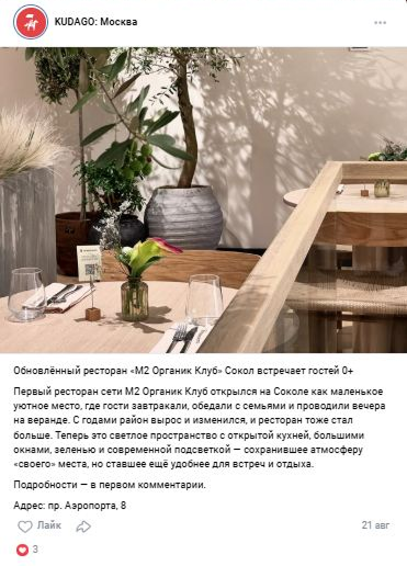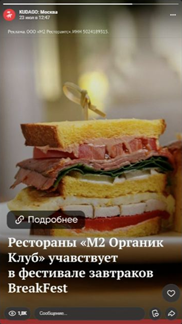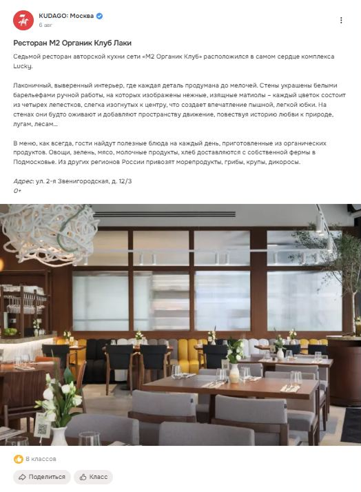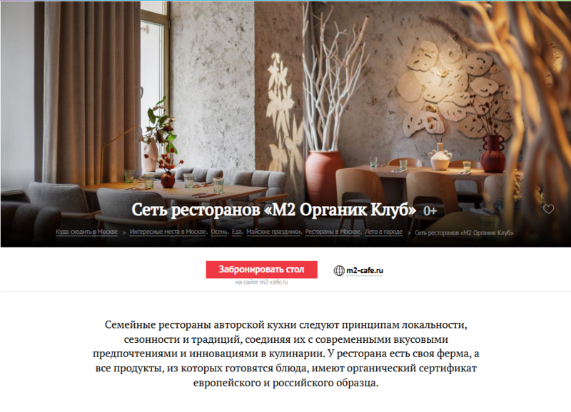 «М2 Органик Клуб» — семейные рестораны авторской кухни следуют принципам локальности, сезонности и традиций, соединяя их с современными вкусовыми предпочтениями и инновациями в кулинарии. У ресторана есть своя ферма, а все продукты, из которых готовятся блюда, имеют органический сертификат европейского и российского образца.
